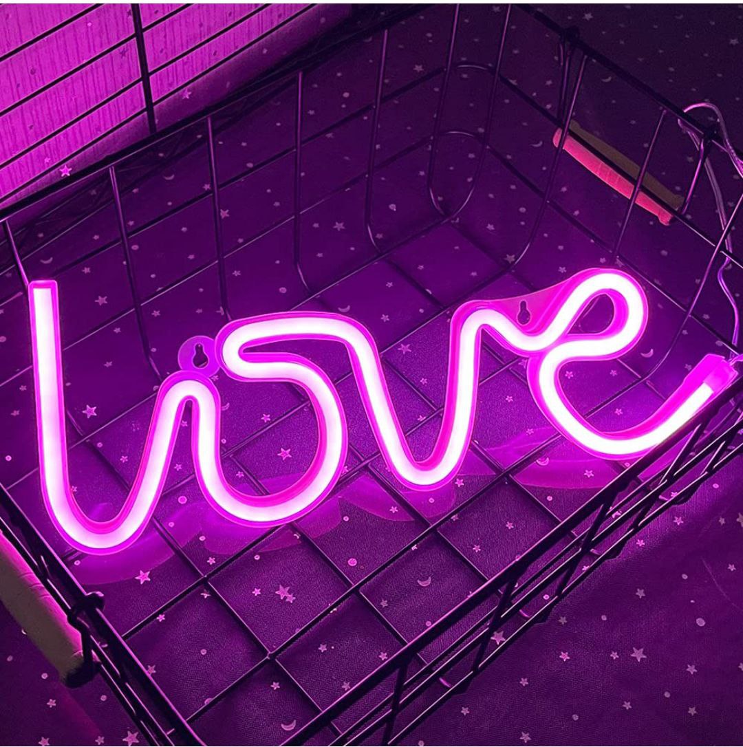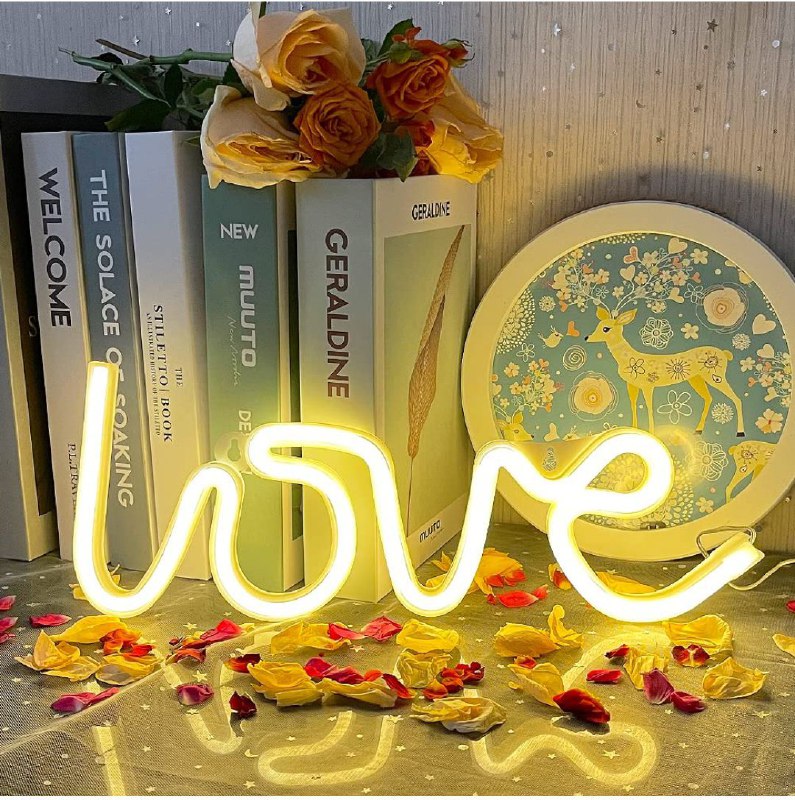 Love ნეონი რომანტიკული LED ნიშანი, რომელიც სივრცეს თბილ და სასიამოვნო ატმოსფეროს ანიჭებს. იდეალურია საძინებლისთვის, ქორწილისთვის ან ინტერიერის დეკორად.